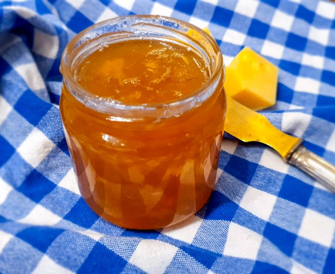 Väga hästi sobis keedisesse ka magus Madagaskari vanilliekstrakt. Lasin kogu kraamil umbes tunnikese kokku podiseda, ja voila, sai valmis imeilus kuldne, hapukas-mõrkjas marmelaad! Mu meelest ideaalne juustumoos (õhuke kiht Gambozola peal on lihtsalt jumalik kombo!), aga passib hästi ka meresoolavõiga võitud värskele hapusaiale. Igatahes midagi teistsugust igapäevase maasikamoosi kõrvale.