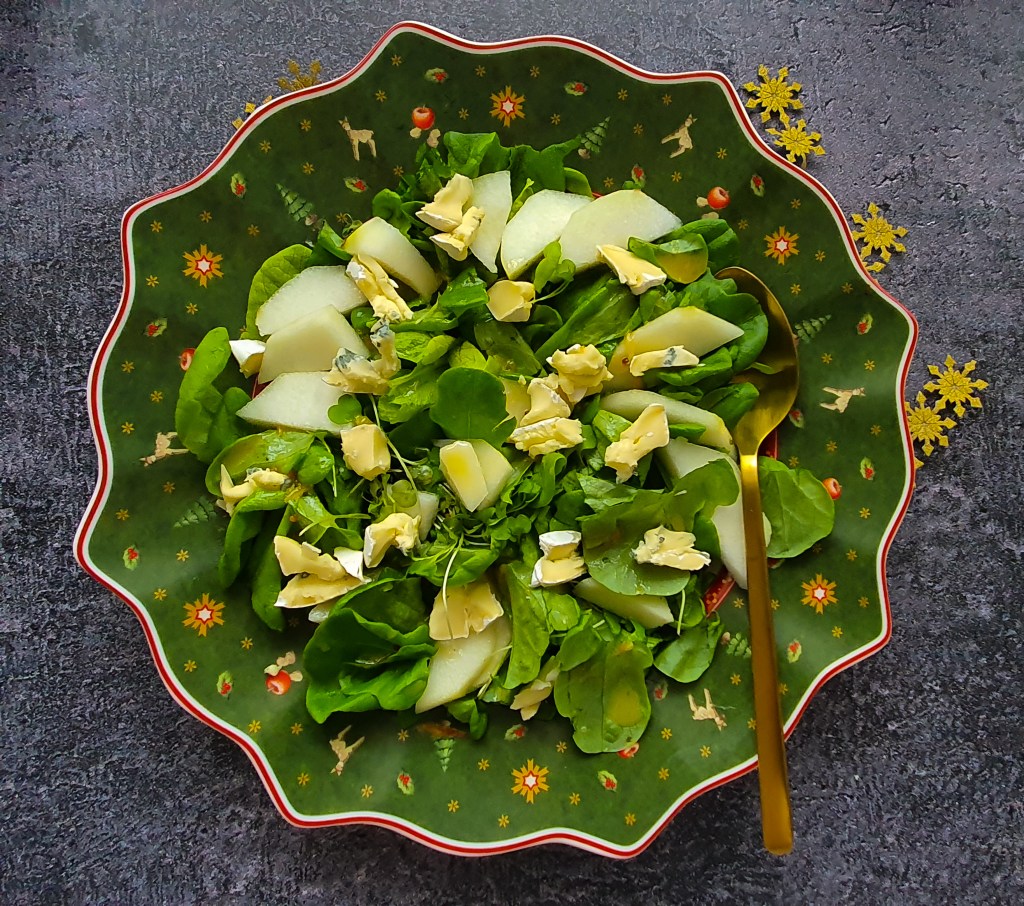 Säti vaagnale salatipõhi ja rukolavõrsed, tilguta peale salatikaste ja lisa veidi soola. Lisa viilutatud pirn ja puista peale tükeldatud sinihallitusjuust. Tegu on magusama alatooniga salatiga, mis sobib mu meelest kenasti kala või linnuliha kõrvale. Kui soovid, võid peale puistata ka röstitud pähkleid.