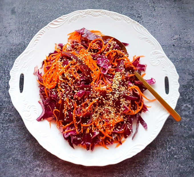 Lõika1-2 keskmist kooritud porgandit ning 300 grammi punast kapsast ribadeks, sega läbi salatikastmega. Salatikastmeks loksuta purgis korralikult segamini 1 laimi mahl, 1 spl agaavisiirupit, 2 spl oliivõli, soola, pipart ja näpuotsaga jahvatatud vürtskööment. Vala kaste salatile ja lase salatil külmkapis umbes tunnikene tõmmata, seejärel raputa peale seesamiseemneid (kui tahad jõulusemat, võid seesamiseemneid kuival pannil mõne minuti ettevaatlikult koos piparkoogimaitseainetega röstida) ning soovi korral värsket koriandrit. Tervislikku nautimist!
