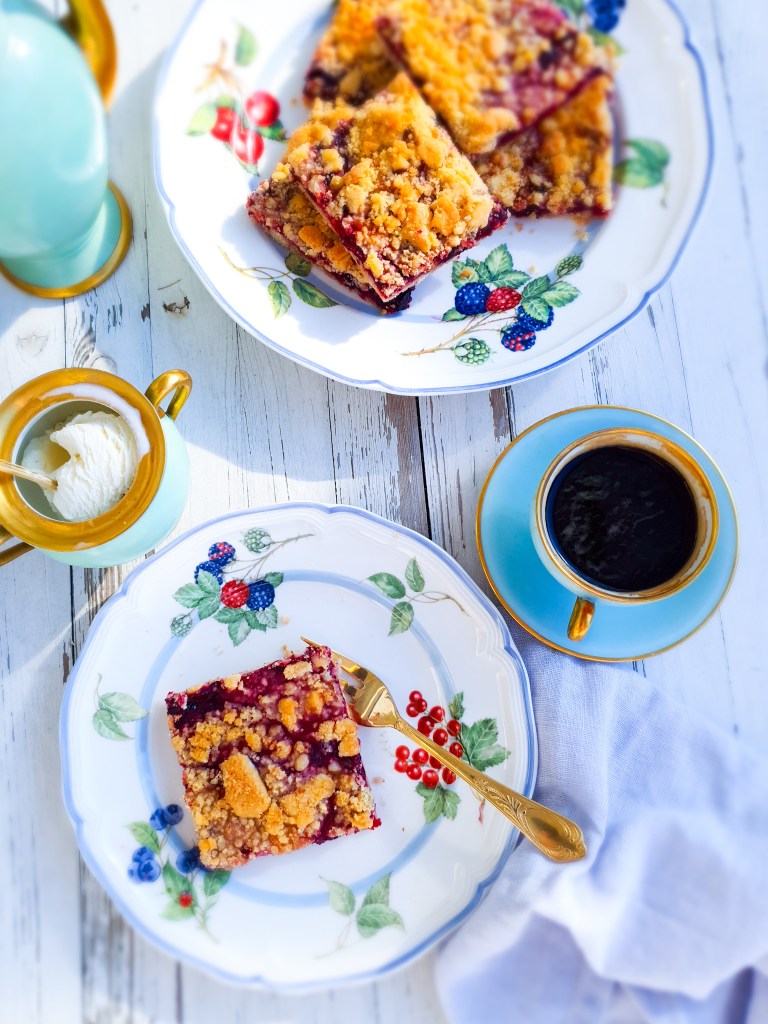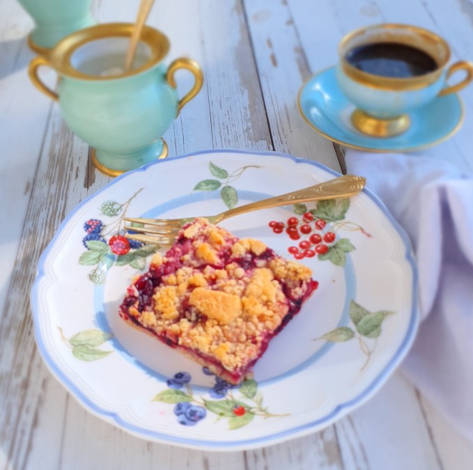 Määri vorm (mul oli ristkülikukujuline 30×20 cm koogivorm) võiga või kata küpsetuspaberiga. Puista alumiseks purukiht, lisa peale marjad ja sellele veel üks purukiht. Küpseta 180C ahjus u 50 min või kuni kook on mõnusalt krõbe ja kuldne. Tõsta jahtuma, et oleks parem lõigata Serveeri vahukoore või vaniljejäätisega, kuid sobib ka niisama tee või kohvikõrvaseks haugata!